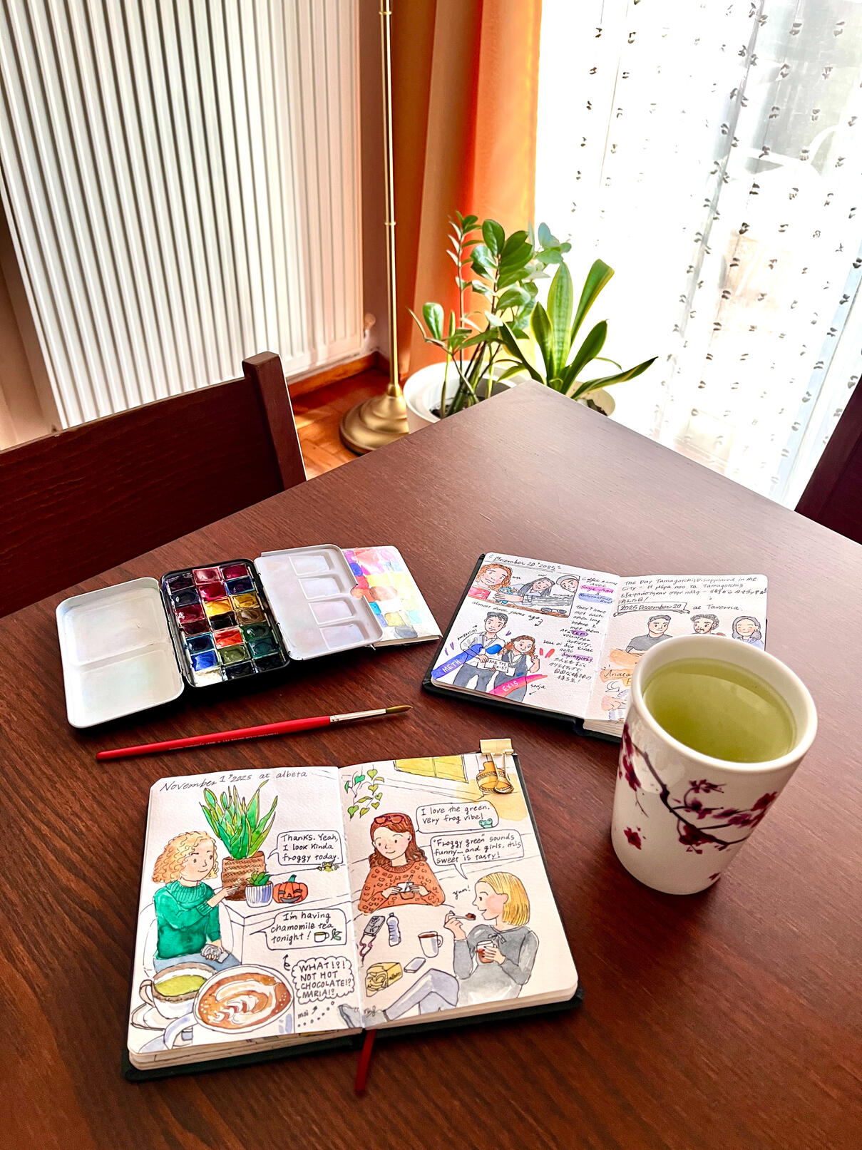 My process begins in a sketchbook, where I draw by hand, then add color with watercolor. I sometimes make minor adjustments using Procreate or Photoshop if needed. I love the feel of hand-drawn work, so I try to keep edits to a minimum. 🎨The tea in the photo is sencha(煎茶), a traditional Japanese green tea - a cup of green tea that begins my mornings! 🍵